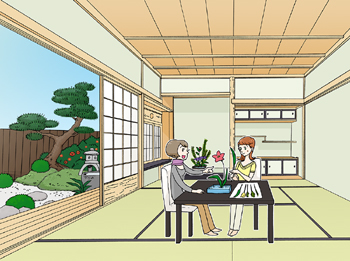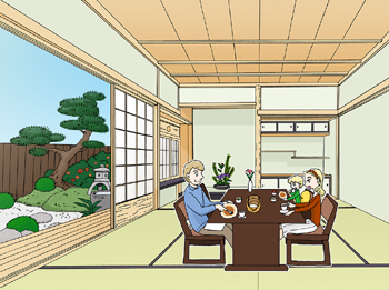 In winter, you can put some coverlets, so that it becomes 'hori-kotatsu'(please move the cursor over the illustration. You will see 'hori-kotatsu-winter style').