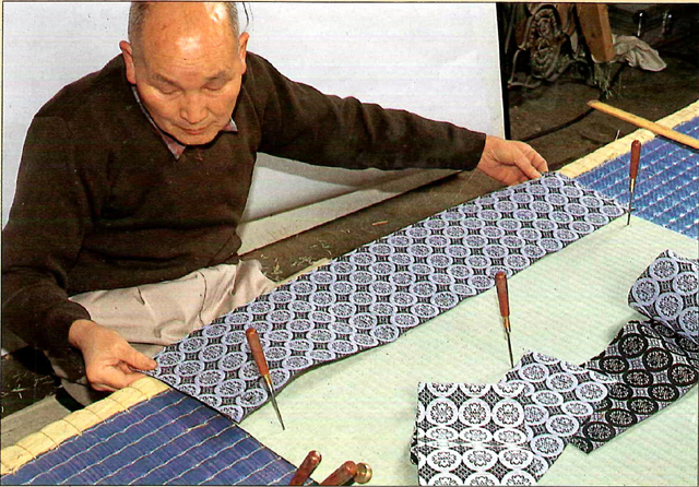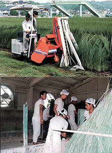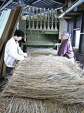 織機で織る前に、傷んだ藺草・悪い藺草・変質している藺草を肉眼でよく見て選り出し、織機にかけます。 |