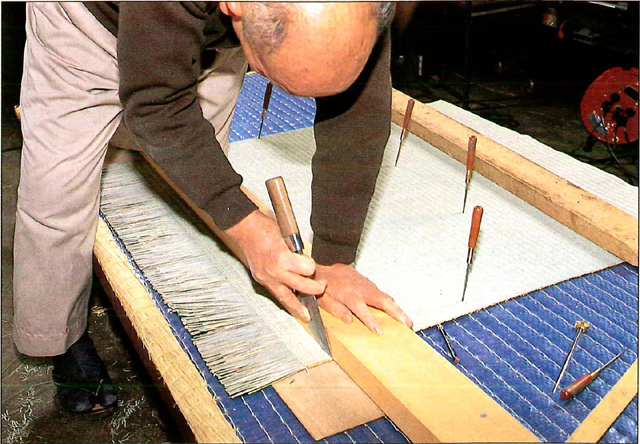 畳表の横からでる麻糸をくくり(カマチ綴じ)、畳縁を付けます。 |