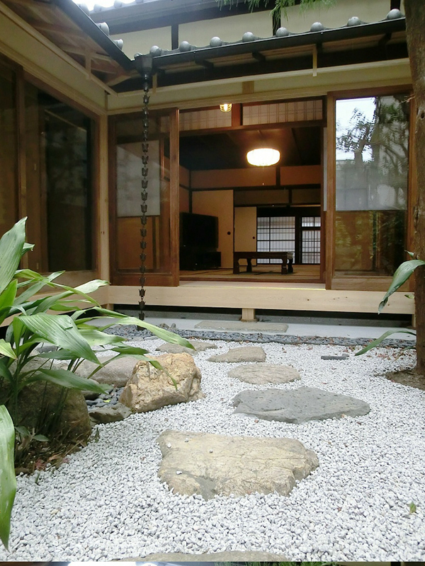 庭を鑑賞する。右奥に吊床がみえる。