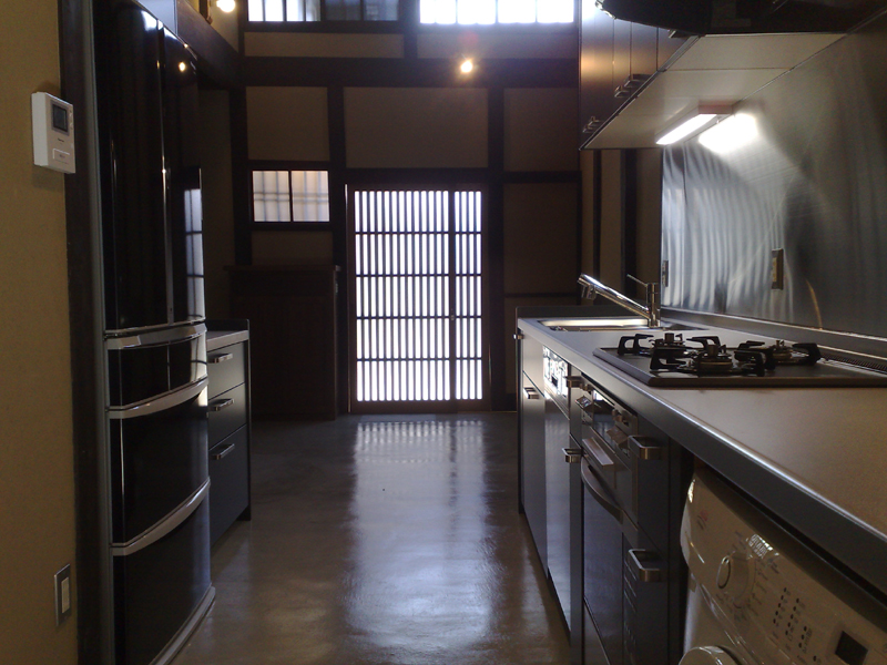 京町家で、土間続きの台所を通り庭と呼ぶ。