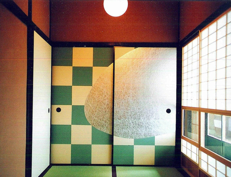 伏せ、柄を移して染め上げた紙。正面の襖は、それを市松模様に張り上げている。