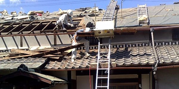| その後、瓦葺の工法は大きく見直された。 従来の土を持って瓦をのせる土葺きから、屋根に打った桟木に瓦を固定する引掛桟葺という手法に変更されたのだ。屋根の重量が大きく軽減されたうえに、1枚1枚の瓦が建物に固定されているため、台風が来てもずれることがない。 「京都大学の実験棟でね、大震災と同じ揺れを再現しても全然大丈夫なんですよ。 何百年かけて完成した瓦がさらに進化しましたね」 工法は進化する。しかし、黙々と棟を積む若い職人を見ていると、体で覚えていくのは昔と同じだ。これからも多くの職人が活躍の機会をまっているだろう。 |