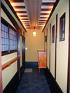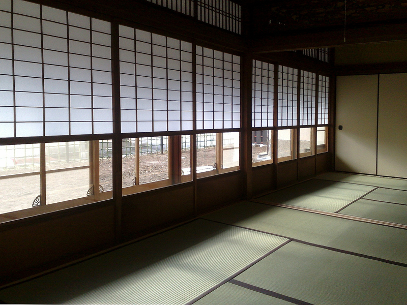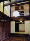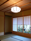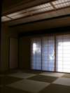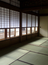 he front papered shouji screens have glass windows behind a sliding bottom half, called 'Yukimi-shouji'. It is easy to see snow outside from this glass window, without opening doors in winter. |