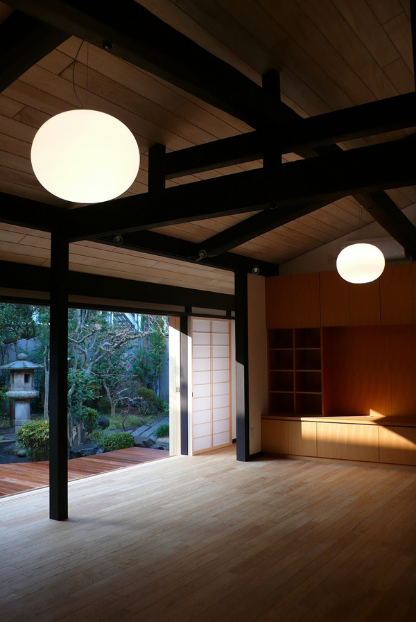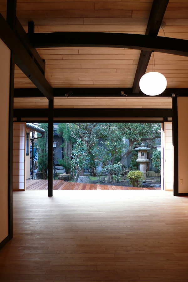 All windows at the terrace are opened so that the living space integrates with the landscape garden. Covering Hinoki-boards over the ceiling brings humidity conditioning effect in the room. |