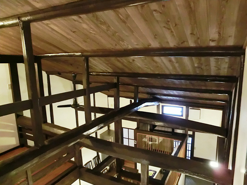 Omoyagi(horizontal woods supporting the roof) are visually shown and the sloped ceiling structure is adopted.