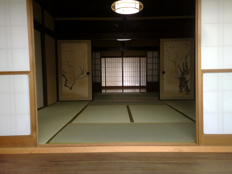 There are Shouji (papered sliding doors)in the backmost, and Fusuma in the middle ones, and another shouji doors in front. The Japanese plum trees are drawn on Fusuma of the middle.