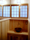Shigaraki-ware is used for a hand-wash bowl. Hinoki-boards are applied on the wall because it is water resistant. |