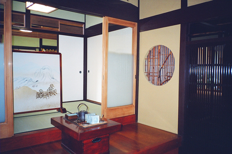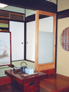 There is a small salver for a tea-cup on Shikidai(step in a Japanese entranceway). On the left-back, there is a partitioning screen on which hills and waters scenery are drawn. |