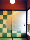 Kyo-Karakami is like a type of woodblock print, and it uses hand-carved printing blocks with traditional patterns. In front, the fusuma with Ichimatsu design(a check pattern) are installed. |